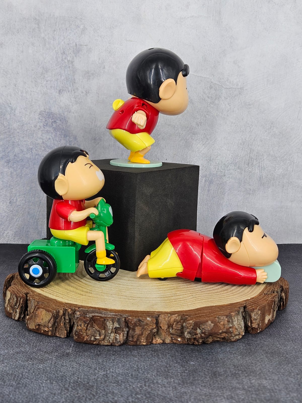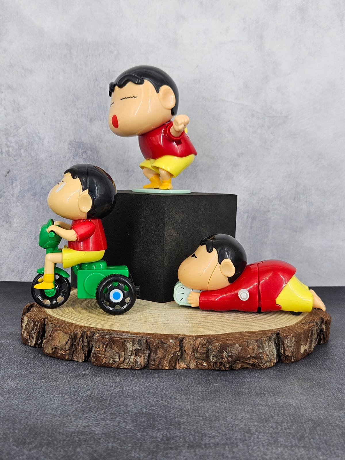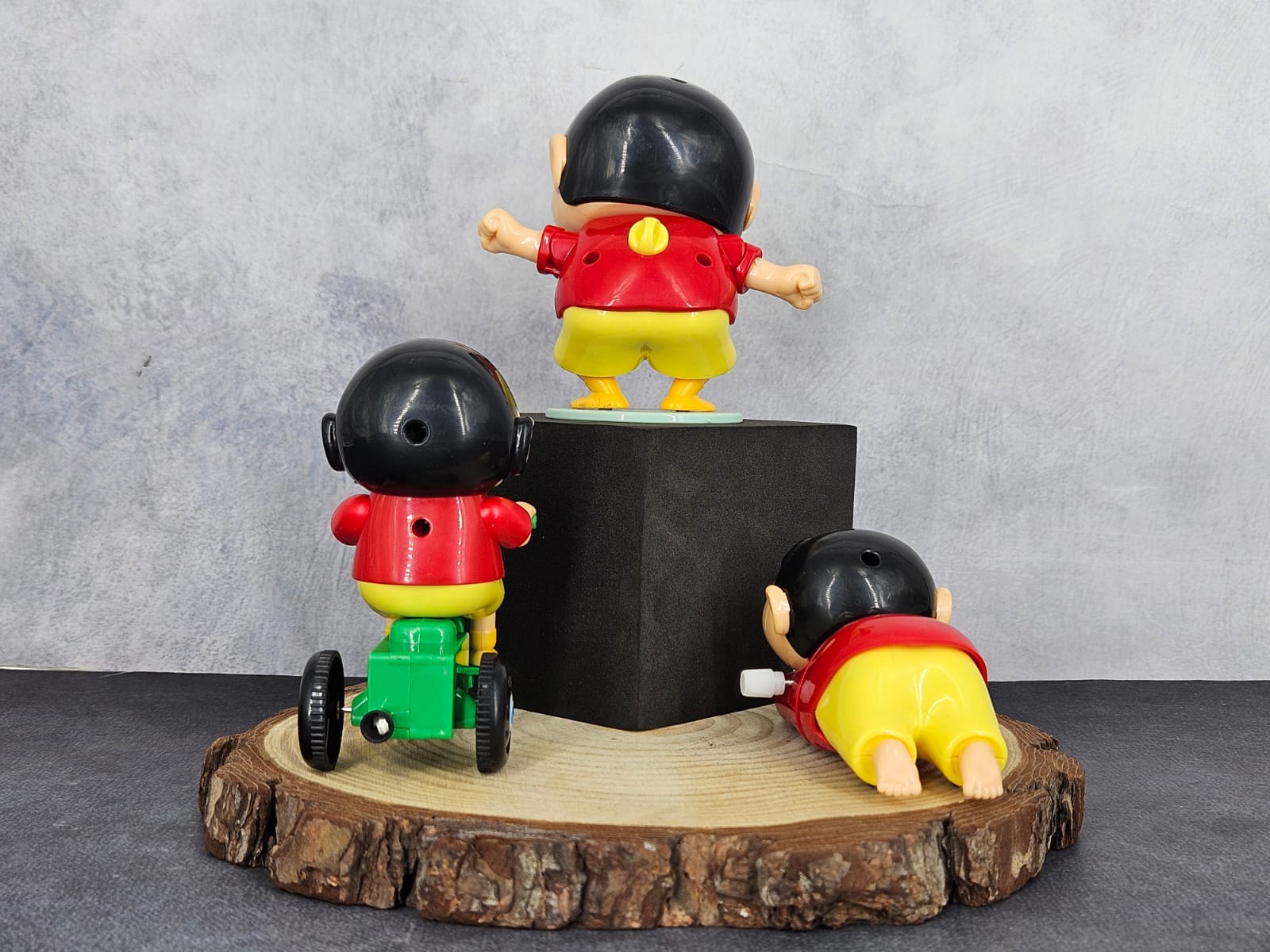🧒 Set of 3 Shinchan Toys – Includes crawling, cycling, and standing Shinchan figures in red shirt.